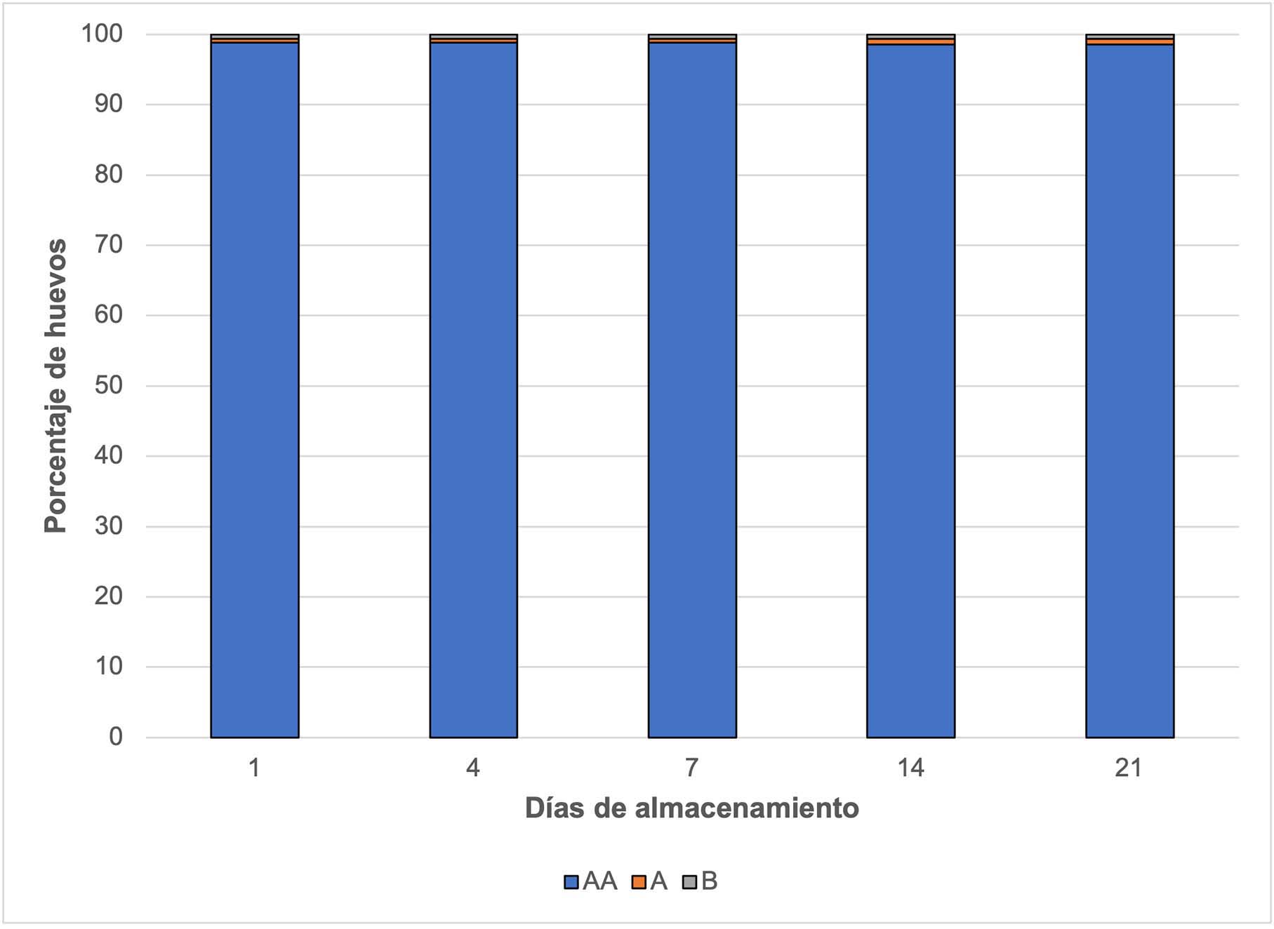 El método de conservación y los días de almacén degradaron la percepción y calificación cualitativa de los huevos por parte del consumidor de acuerdo con la escala del USDA (2000). En ambiente controlado (Figura 3), fue posible observar la mayor cantidad de huevos de clasificación AA desde el día uno de análisis hasta el día veintiuno. Sin embargo, al evaluar los huevos en temperatura ambiente (Figura 4), se denotó cómo desde el día uno de análisis se presentó una reducción en la cantidad de huevos de clasificación AA y se encontró una mayor proporción de huevos tipo A y B.