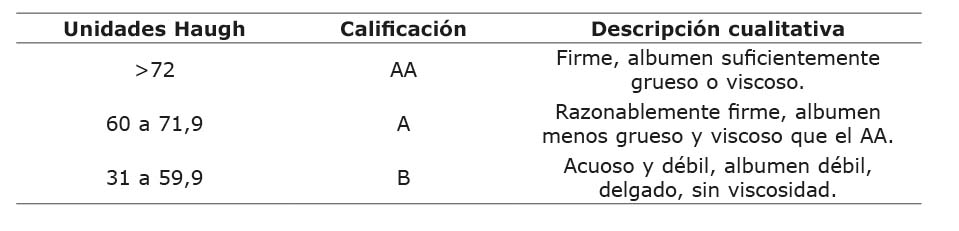 La calidad del huevo comercial se puede determinar a través la medición de parámetros externos e internos. En la calidad externa del huevo se evalúa su forma y peso, el índice morfológico, el color de la cáscara, así como su calidad física, su limpieza, resistencia a la quebradura y su uniformidad (King’ori, 2012). En cuanto a calidad interna se analiza el valor nutricional del huevo, lo cual se determinada por medio de análisis a nivel del laboratorio, en donde se obtiene su valor proteico (12,5 g/100g), grasas y micronutrientes. Asimismo, se obtienen las unidades Haugh, el índice de yema (IY), el grosor de la cáscara, así como posibles manchas de sangre o de carne. Las unidades Haugh determinan la consistencia del albumen denso presente en el huevo, el parámetro es determinado por medio de la fórmula UH= 100 Log (H-1,7* P *2,37 +7,57), en donde se relaciona el peso del huevo con la altura del albumen denso. El índice de yema relaciona la altura y el diámetro de la yema y se encuentra estrechamente relacionado con las UH, por ende, su reducción genera una disminución paralela del IY; ambos parámetros determinan la calidad de la clara. Alrededor de un 10 % de los huevos producidos por las aves, son desechados debido a defectos externos, mientras que el 1 % por defectos internos (Carbajal, 2006; Cruz Rey de las Moras, 2008; Huyghebaert, 2006).