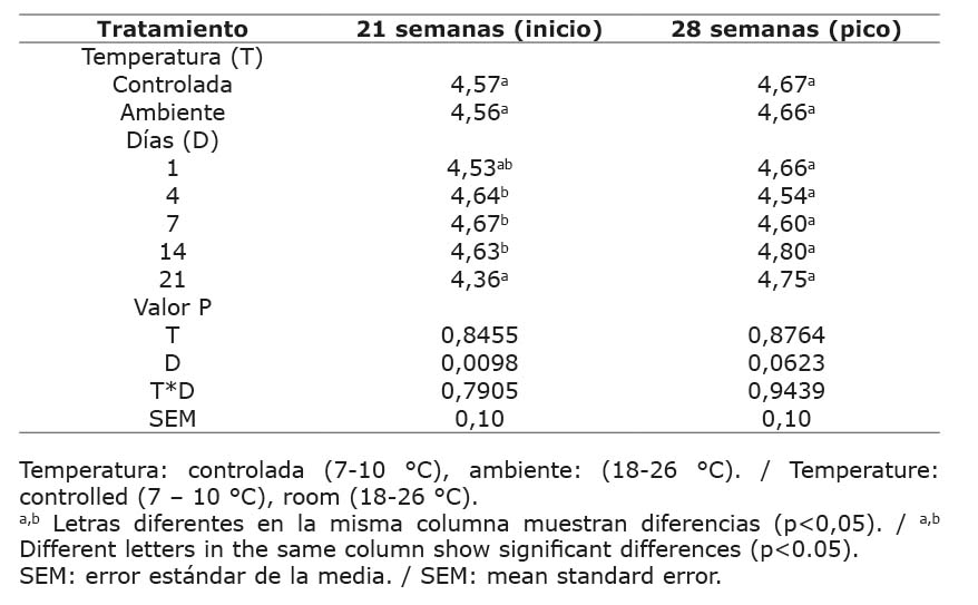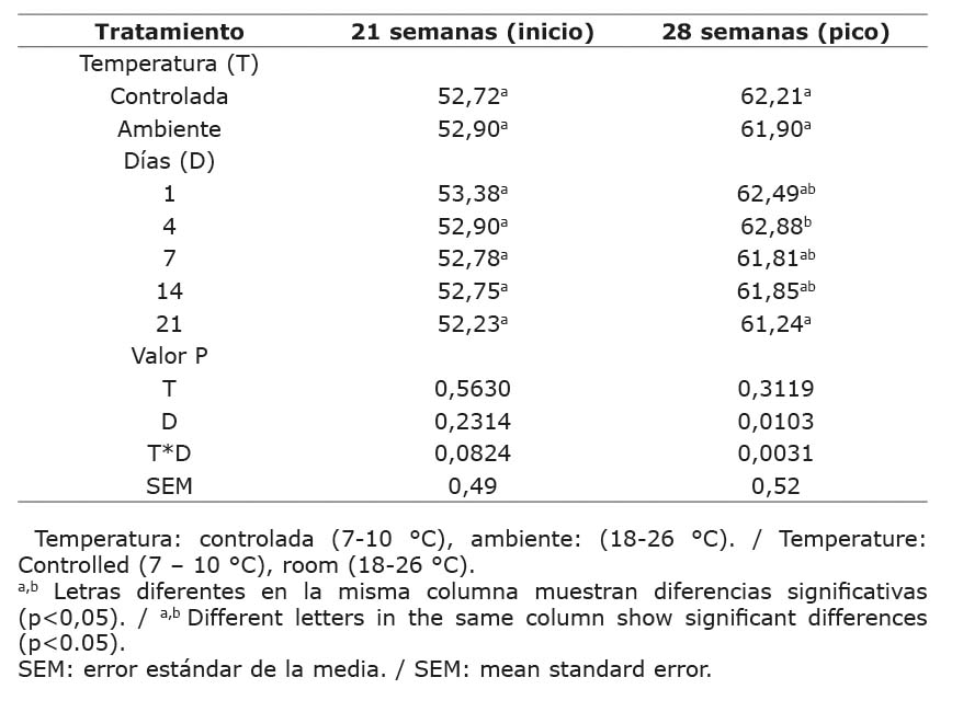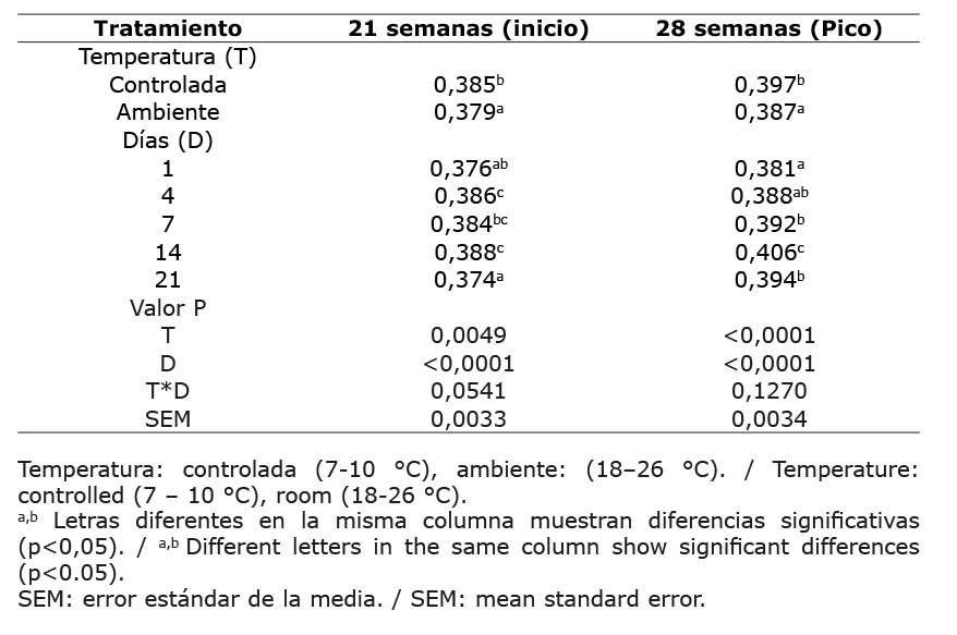 Los valores obtenidos del color de yema presentaron diferencias significativas cuando se evaluaron los días de almacenamiento, tanto durante el inicio de producción como para pico de producción. Dichos valores no mostraron diferencias significativas cuando el análisis se realizó para el efecto de temperatura de almacén, ni para la interacción entre ambas variables (Cuadro 5).