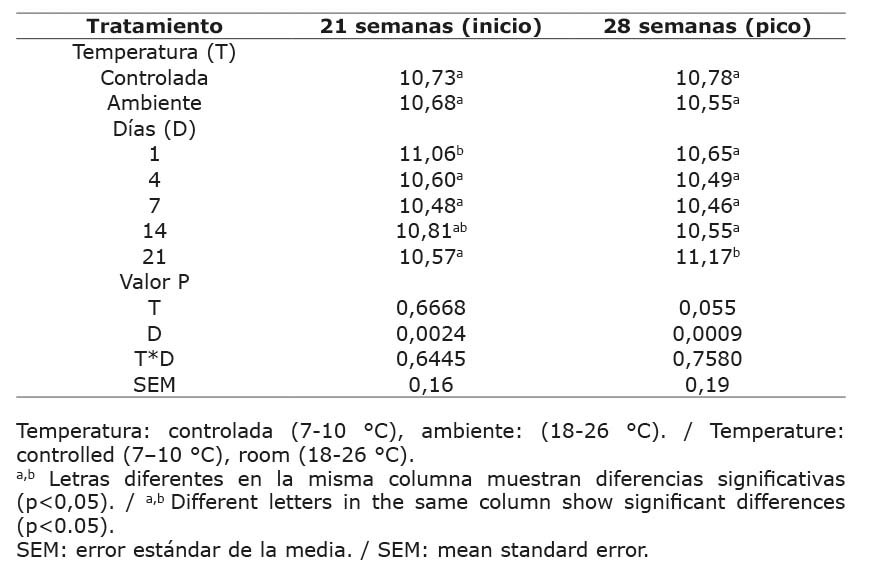 Los resultados de pico de producción coincidieron con diferentes reportes en la literatura. En un estudio donde se evaluó la interacción entre la temperatura (5 y 28 °C) y el tiempo de almacén del huevo (7, 14 y 21 días) para aves de 32 semanas de edad, Gallardo Vela et al. (2018) indicaron diferencias en el peso de huevo. En otro estudio se determinó que el peso de huevo no disminuyó cuando se almacenó a 5 o 10 °C durante diez días, pero en el almacenamiento a los 29 °C sí se presentó una disminución significativa (Jin et al., 2011).