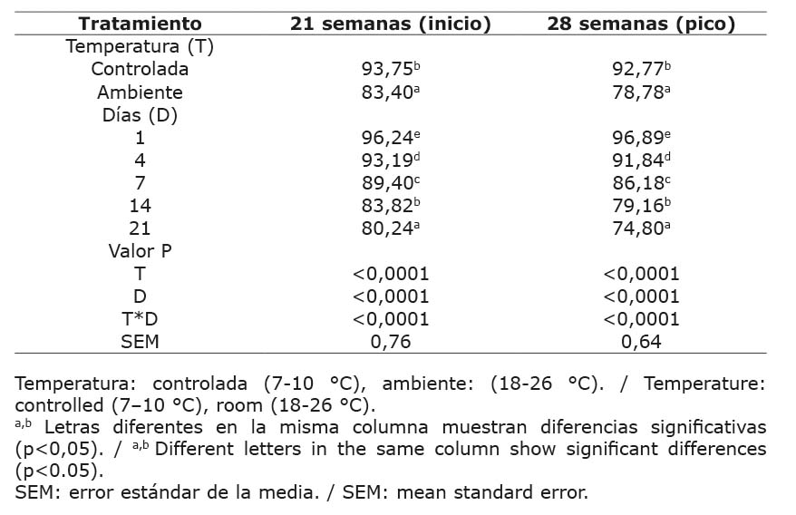 En el análisis efectuado se observó cómo la temperatura y los días de almacenamiento, así como la interacción entre ambos tratamientos, presentaron diferencias significativas para las unidades Haugh (Cuadro 6), tanto en inicio como en el pico de producción. El análisis de las temperaturas de almacén mostró que las unidades Haugh obtenidas a temperaturas ambientes fueron menores que las obtenidas a temperaturas controladas y que, conforme transcurrieron los días de almacenamiento, los huevos perdieron unidades Haugh. Del mismo modo, se observó que, tras el aumento de los días de almacén, la pérdida de unidades Haugh fue más pronunciada cuando la temperatura de conservación fue la ambiental (Figura 2).