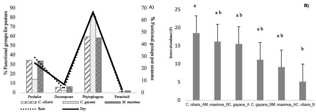 Figura 1. Entomofauna asociada con tres pasturas (C. ciliaris, M. maximus, C. gayana) en dos estaciones (Lluvioso: A y sequía: B) del centro de investigación Motilonia, Cesar, Colombia. A) Grupos funcionales. B) abundancia de insectos. Diferentes letras muestran diferencias estadísticas (p<0,05). Corporación Colombiana de Investigación Agropecuaria (AGROSAVIA), Centro de Investigación Motilonia, Agustín Codazzi, Cesar, Colombia. 2019-2020.