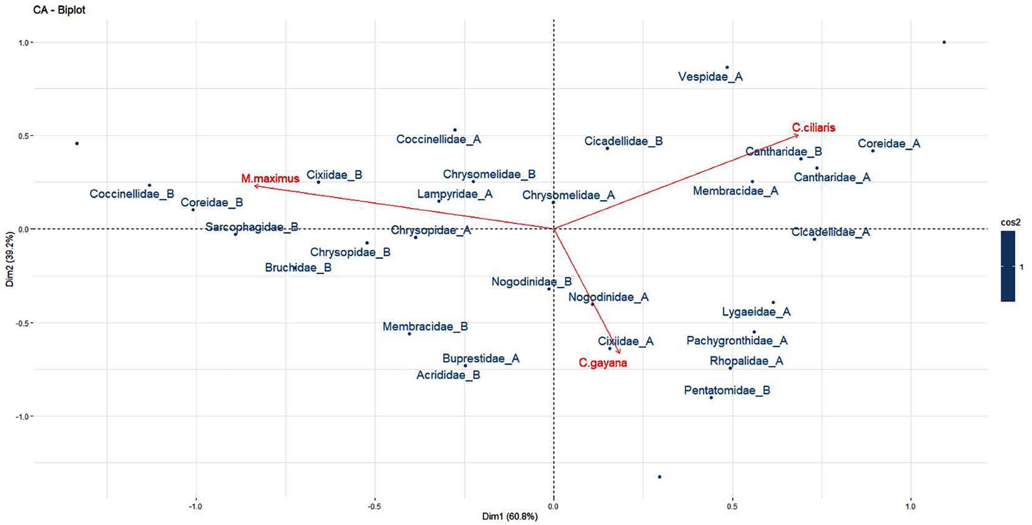 The simple correspondence analysis revealed that the percentages of accumulated variance were 60.8 % and 39.2 % for the first and second dimensions, respectively. The first dimension was represented mainly by C. gayana (0.75) and the second by C. ciliaris (0.71) and M. maximus (0.73). Also, the relationship with the rainy (A) and drought (B) seasons was considerable. The families of insects with the most significant association with C. gayana, from the functional group of phytophages, were Cerambycidae_B, Curculionidae_B, and Pentatomidae _B. The predator families were Vespidae_ B and Chrysopidae_B. Finally, two of the three families of parasitoids were recorded in this pasture (Platygastridae_B, Chalcididae_A and B).