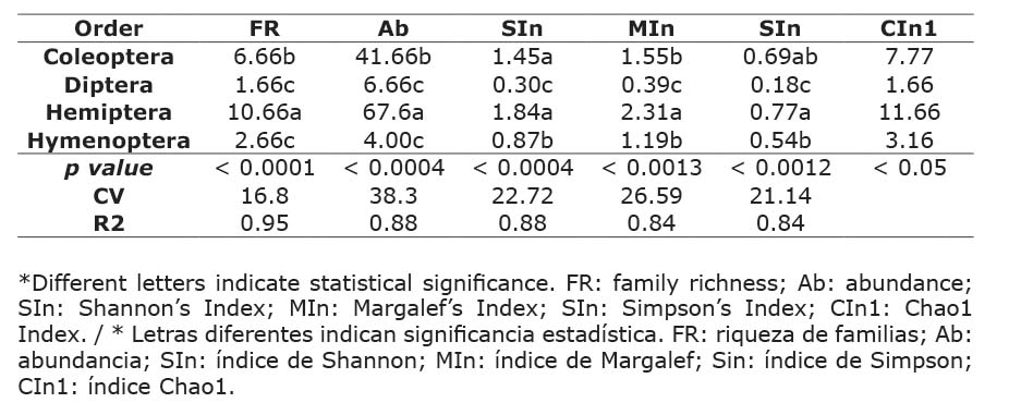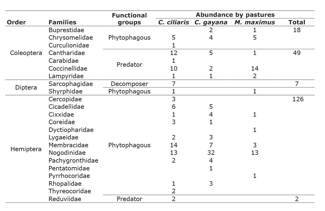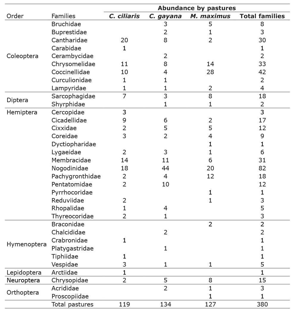 The results showed that 380 individuals were collected, distributed in seven orders and 35 families (Table 1). When analyzing insect diversity, a statistically significant difference between richness of the families (FR: number of families) grouped by order (p<0.0001) was noted, being greater in Hemiptera (10.66), followed by Coleoptera (6.66 FR), Hymenoptera (2.66 FR), and Diptera (1.66 FR). Abundance (Ab: number of individuals) results were similar, since Hemiptera was the most abundant (67.6 Ab), and Hymenoptera (4.00 Ab) the least (Table 2). When classifying insect abundance for each pasture, C. gayana had the most individuals (134 Ab), followed by M. maximus (127 Ab), and C. ciliaris (119 Ab). Hemiptera was the one with the highest number of individuals in the three pastures, being C. gayana the one with the highest average, following of Coleoptera mainly in M. maximus (Table 3).