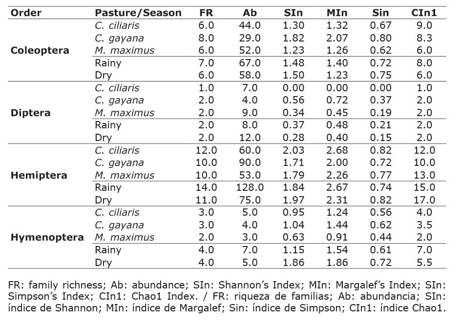 In C. ciliaris, was found that the highest abundance of the entomofauna was defined by the orders Orthoptera, Isoptera, and Hymenoptera (Patel, 2015), contrary to the results found in this study, since no Isoptera insects were reported and the abundance of the other orders was very limited not only in C. ciliaris. The plant component, depending on the use that insects make of it, may or may not favor the presence of pest and beneficial insects. It could also be considered that, in species highly adapted to drought conditions such as M. maximus, biomass availability could not be strongly compromised as it is a food source for insects in times of low rainfall (Barragán-Hernández & Cajas-Girón, 2019). This condition probably created a favorable environment and promoted a greater abundance of the entomofauna in this pasture during the dry season. The population dynamics of insects decreased when the average temperature increased (Yarupaita Echevarria, 2016).