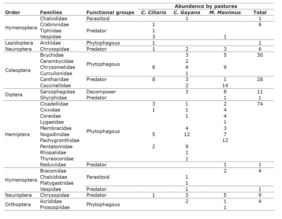Entomofauna associated to tropical pastures, Cenchrus ciliaris, Chloris gayana, and Megathyrsus maximus1