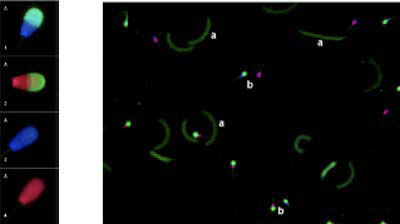En la izquierda se observan cabezas de espermatozoides con las diferentes combinaciones de arriba hacia abajo: membrana plasmática y acrosoma intacto; membrana plasmática dañada y acrosoma intacto; membrana plasmática intacta y acrosoma dañado; y ambas membranas dañadas. En la derecha se observa cómo es posible analizar el movimiento de las células al mismo tiempo que se analiza el estado de sus membranas.
