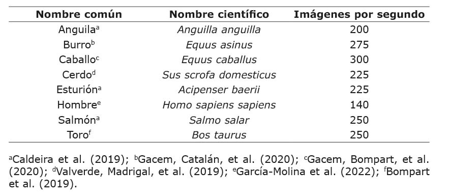 Table 1. Optimal image capture frequencies for the kinematic analysis with CASA-Mot systems according with the species considered.