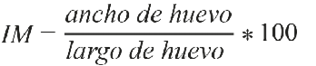 Las fórmulas utilizadas para la determinación del índice morfológico (IM) (ecuación 1) (Scholtyssek, 1970), índice de yema (IY) (ecuación 2) (Artan & Durmuş, 2015) y unidades Haugh (UH) (ecuación 3) (Silversides, 1994) se muestran a continuación: