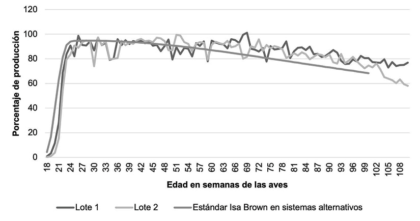 El porcentaje de producción durante un período de 92 semanas mostró un pico para el L1 de 98,7 % y L2 de 97,4 % en las semanas 26 y 31 de edad del ave, respectivamente (Figura 1), los cuales fueron superiores al esperado según el estándar de la línea (95 %). De igual manera, se determinó una mayor persistencia en ambos lotes (L1 y L2) a partir de la semana 60 (Figura 1).
