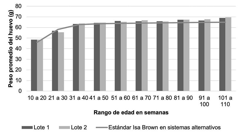 Hubo un aumento significativo (p<0,05) del peso promedio del huevo conforme incrementó la edad de la gallina (Figura 2). El estándar de la línea describe un peso promedio del huevo de 63,1 g durante la semana 18 a la 100, mientras que, en este estudio se identificaron resultados similares, con un peso promedio de 63,84 g para L1 y de 63,02 g para L2.