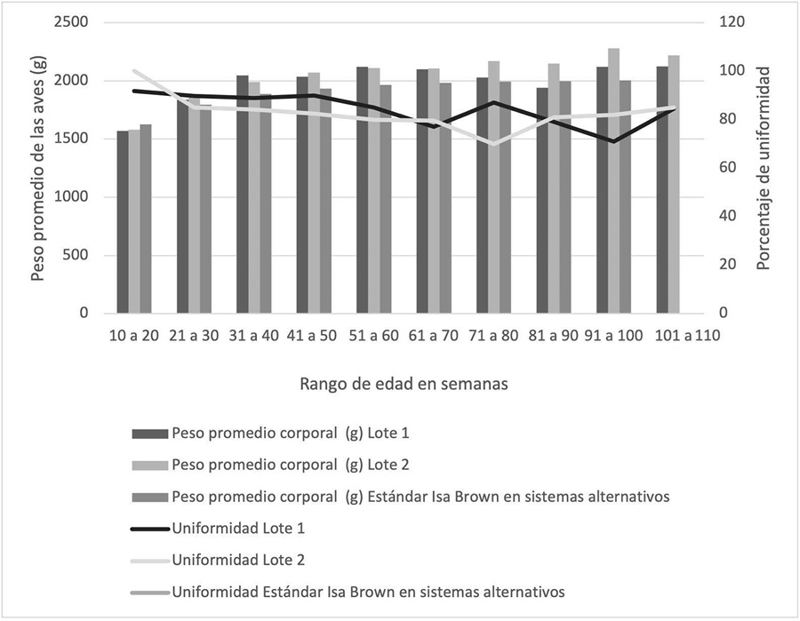 El peso corporal de las gallinas (expresado en rangos promedios de diez semanas) aumentó conforme se incrementó la edad en el ave; donde el L1 promedio 1992 g y 2056 g para el L2; valores similares a los 2000 g descritos por el estándar de la línea (Figura 3).