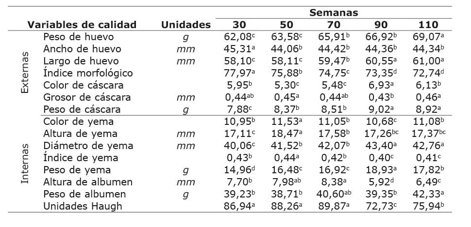 Table 1. Internal and external quality variables of the egg obtained from ISA Brown hens (Gallus gallus domesticus) with access to grazing according to the week of production, Turrialba, Cartago, Costa Rica. 2020.