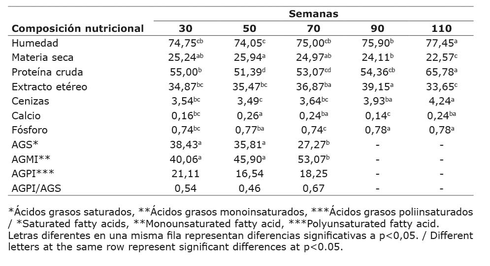 El análisis nutricional realizado al conjunto de la yema y albumen proveniente de huevos de las gallinas ISA Brown en la edad de 30, 50, 70, 90 y 110 semanas (Cuadro 2), mostró una relación positiva entre la edad del ave y los contenidos de humedad, proteína cruda, extracto etéreo, cenizas, calcio y fósforo; mientras que el contenido de materia seca, la concentración de ácidos grasos saturados (AGS) y los monoinsaturados (AGMI), mostraron una reducción. En los ácidos grasos poliinsaturados (AGPI), no se encontraron diferencias entre las edades de las gallinas evaluadas. La relación AGPI/AGS mostrada por los huevos fue de 0,55, 0,46 y 0,67 en las semanas 30, 50 y 70, respectivamente.