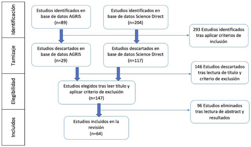 Este trabajo integra publicaciones originales tomadas como referencia de las bases de datos AGRIS y Science Direct. A partir de ello, se aplicaron tratamientos de identificación, tamizaje, elegibilidad e inclusión de referencias, se comenzó con 293 y se terminó con 64 artículos. En la identificación se abordaron los términos de búsqueda relacionados con “Agricultural” y “Traceability”, los cuales fueron validados con el tesauro de la Organización de las Naciones Unidas para la Alimentación y la Agricultura. Se utilizó el operador booleano AND para normalizar la búsqueda. Entre los tratamientos de identificación y tamizaje, se aplicó como criterios de inclusión artículos publicados entre los años 2017 hasta el presente, para obtener un análisis más reciente que permita caracterizar la adopción de tecnologías vigentes en trazabilidad. También se incluyeron artículos que se relacionan con el área de “Agricultural and Biological Sciences” y publicaciones asociadas a “Computer and Electronics in Agriculture”. Luego, entre los tratamientos de tamizaje y elegibilidad, se descartaron los artículos relacionados con actividades pecuarias, para centrar la revisión de forma exclusiva a las actividades agrícolas. Tras lectura de los resúmenes y resultados se seleccionaron 64 artículos que fueron el total de incluidos en la revisión (Figura 1).