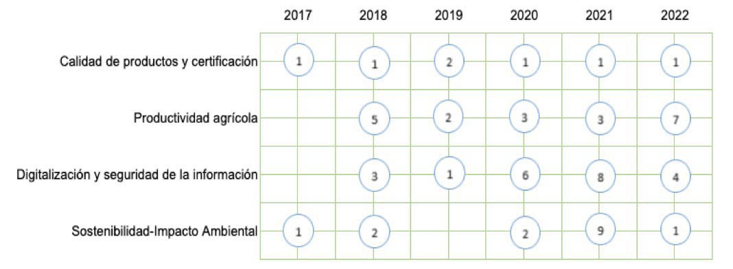 El número de publicaciones refleja tendencias de crecimiento en participación, en la categoría productividad agrícola en el año 2022 (Figura 2). Sin embargo, al analizar las publicaciones a lo largo de los seis años de manera general, la digitalización y seguridad de la información ha sido el principal referente de interés de publicación por parte de la comunidad científica, con una proporción del 34 %, seguido por la categoría de productividad agrícola e impacto ambiental con un 31 % y 23 %, respectivamente. Cabe destacar que la categoría calidad de los productos y certificación, a pesar de que presentó menor participación en publicaciones, se mantuvo vigente a lo largo de la ventana de tiempo. Los aportes identificados en cada categoría se presentan a continuación.