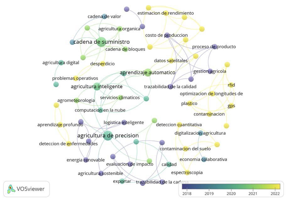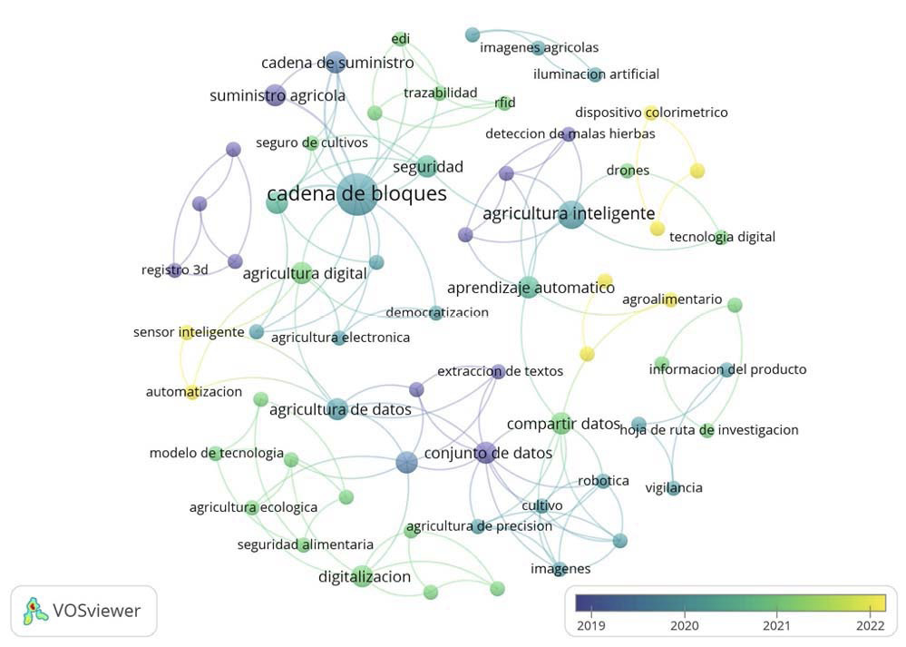 En el análisis de asociación entre unidades (Figura 3), se identificaron 66 nodos agrupados en catorce clúster para un total de veintidós artículos en esta categoría. El nodo que presentó mayor grado de centralidad fue “cadena de bloques”, con probabilidad de ocurrencia del 9 % en al menos seis referencias. Otros nodos con grado de centralidad representativo fueron: “cadena de suministro (supply chain)”, “seguridad de la información (information security)”, “contratos inteligentes (smart contract)”, “innovación en agricultura (agricultural innovation)”, “datos compartidos (data sharing)”, “aprendizaje de máquina (machine learning)”, “agricultura inteligente (smart agriculture)”, “visión por computador (computer vision)”, entre otros, con probabilidad de ocurrencia del 3 % cada uno. Para el año 2022 se identificaron tendencias en tecnologías de medición espectral, geo-estadística, transmisión de datos y agricultura digital (digital farming) para trazabilidad agrícola.