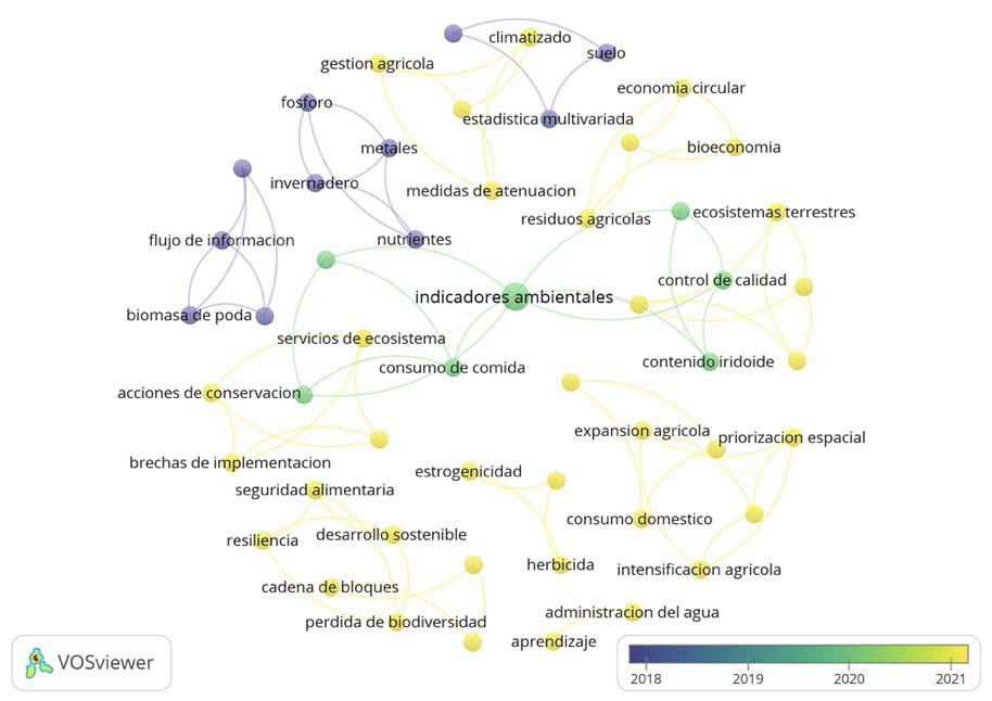 En el análisis de asociación entre unidades (Figura 5), se identificaron 55 nodos agrupados en quince clúster para un total de quince artículos. Esto indica que no existió centralidad en las unidades de análisis de esta categoría, dado que agrupó los nodos en la misma cantidad de artículos. Solo el nodo “indicadores ambientales (environmental indicators)” compartió co-ocurrencia en dos referencias con probabilidad del 3,6 %.