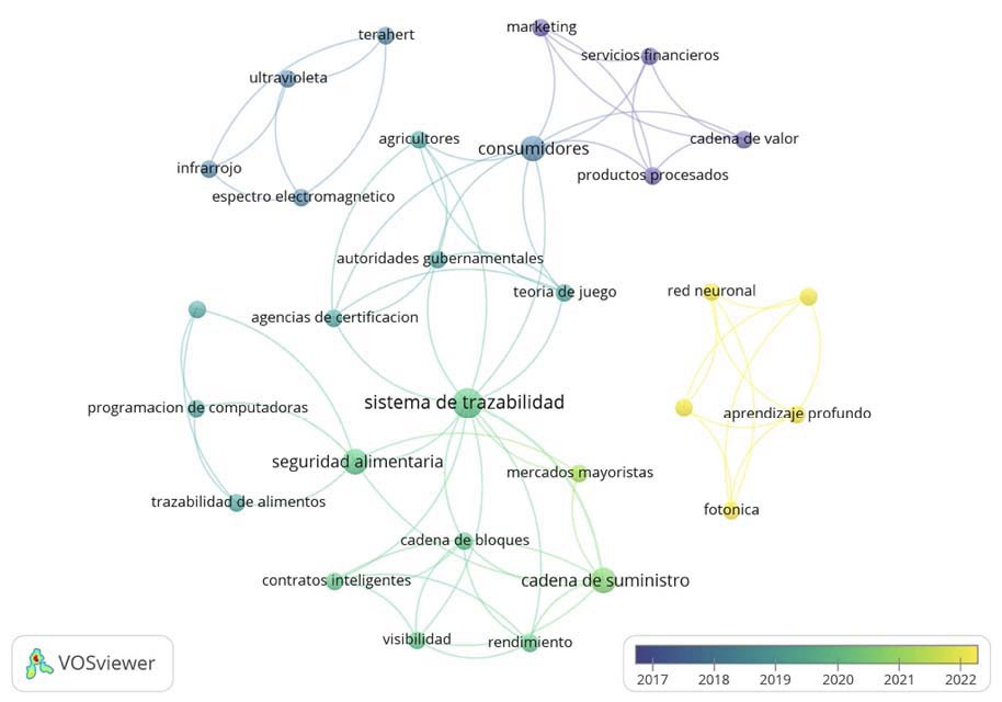 En el análisis de asociación entre unidades (Figura 5), se identificaron veintinueve nodos agrupados en seis clúster para un total de siete artículos. El nodo que presentó mayor grado de centralidad fue “sistema de trazabilidad (traceability system)” con una probabilidad de ocurrencia del 10,3 % en al menos tres referencias. Otros nodos con grado de centralidad representativo fueron “consumidores (consumers)”, “cadena de suministro” y “seguridad alimentaria (food safety)” con probabilidad de ocurrencia del 6,8 % cada uno. Para el año 2022 se identificaron tendencias de trazabilidad asociadas a medir servicios financieros (financial services), marketing, cadena de valor (value chain) y productos procesados (product processed).