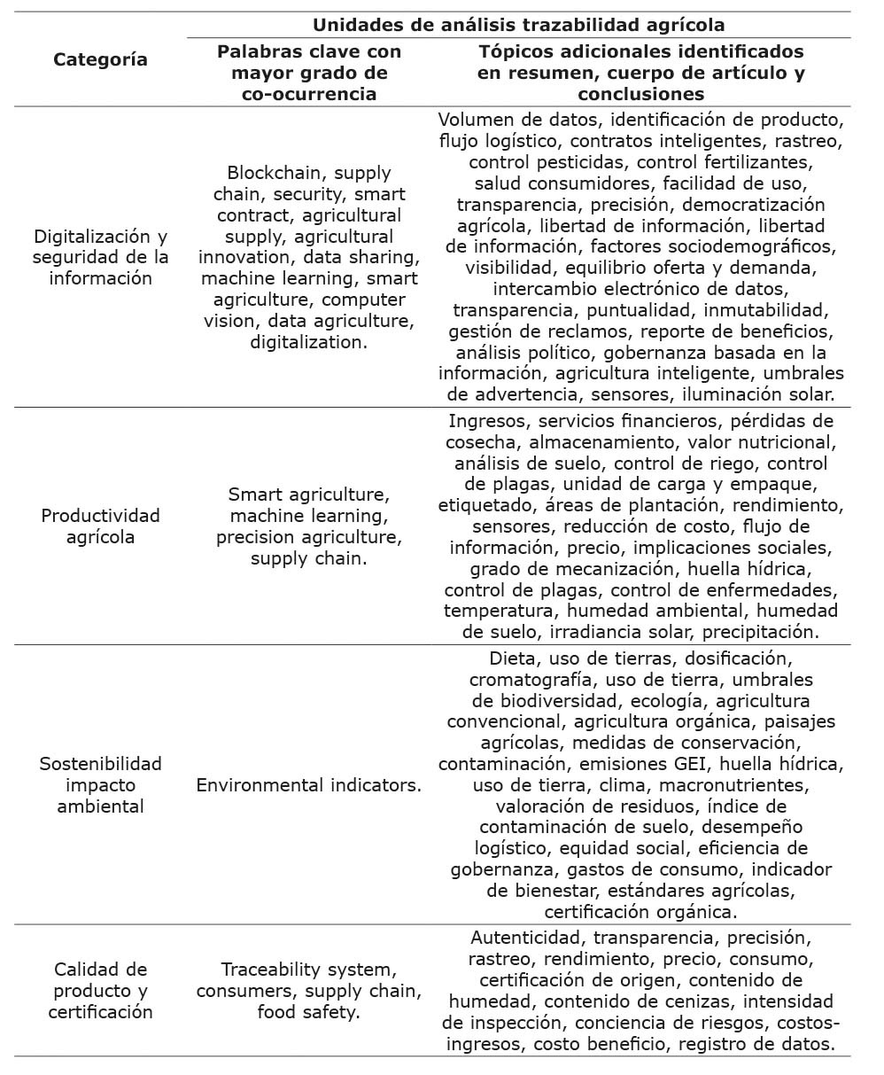 Los objetos y alcances de seguimiento clasificados en cuatro categorías generales establecieron áreas de potencial desarrollo, las que están asociadas a la evolución tecnológica (digitalización y seguridad de datos) que presentan los sistemas de trazabilidad agrícola. De manera específica, se evidenció que los estudios y publicaciones seleccionados en la revisión, integraron la función de control de diversas variables técnicas y tuvieron en común unidades de análisis, entre ellas cadena de bloques, agricultura de precisión, agricultura inteligente, trazabilidad de alimentos, digitalización agrícola, desarrollo sostenible, georreferenciación, control de calidad, seguridad alimentaria y bioeconomía. Estas unidades determinan líneas emergentes de investigación como solución a diferentes necesidades de registro y monitoreo en procesos agrícolas en los que intervienen diferentes actores de la cadena de suministro, en especial el productor. Con base en que en el 94 % de las referencias consultadas se intervino de forma directa sobre el productor, la comunidad científica tiene el reto de ampliar el alcance de medición de manera transversal con los actores en la cadena de suministro agrícola para lograr mayor impacto en sus resultados.