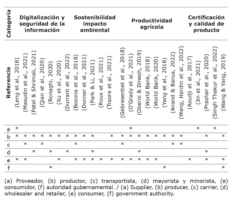 El análisis de artículos incluidos en la revisión, reflejó en todas las categorías de clasificación, la adopción de la función de trazabilidad por parte de los distintos actores a lo largo de la cadena de suministro agrícola, entre ellos proveedores, productores, transportistas, mayorista y minorista, consumidor y autoridad gubernamental. Los resultados del análisis demostraron mayor recurrencia de publicaciones enfocadas al productor, lo que presenta más opciones de consulta científica de acuerdo con los referentes incluidos y los criterios de búsqueda (Cuadro 2).