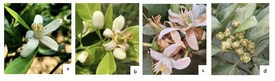 Figure 1. Harvested orange tissues (Citrus sinensis) for fungi isolation: petals without symptoms (a), petals with early symptoms (b), petals with advanced symptoms (c), calyx and pedicel (d). Brasilia, Alajuela, Costa Rica. 2021.