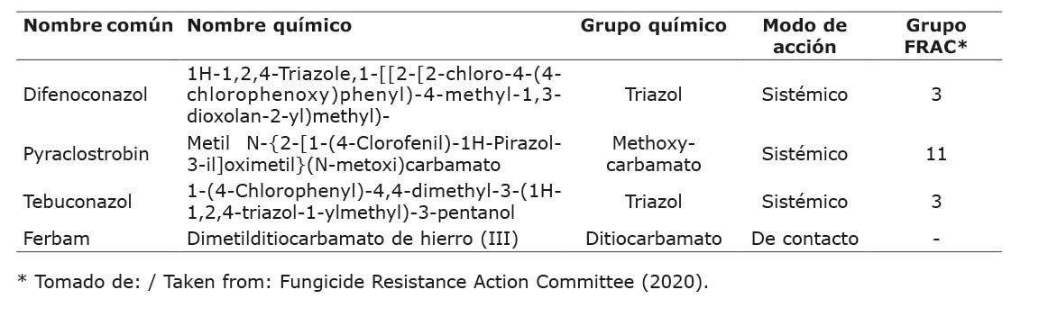 Para la evaluación se seleccionaron cuatro fungicidas disponibles a nivel comercial en Costa Rica (Cuadro 1).