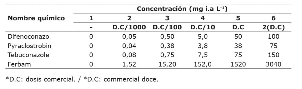 Fungicide Resistance Action Committee (2020)Se realizaron ensayos de inhibición por medio de la técnica del medio enmendado. Se emplearon placas multipozos, cada placa tenía veinticuatro pozos de 1,7 cm de diámetro cada uno. En cada pozo se colocó 1 mL de PDA al que se le agregó uno de los fungicidas, esto de acuerdo con la metodología empleada por Arce-Araya et al. (2019). Se evaluaron cinco concentraciones de cada fungicida, además de un testigo. Las concentraciones fueron elegidas y calculadas a partir de la dosis comercial recomendada del producto (Cuadro 2). Para cada aislamiento se realizó un total de cuatro repeticiones por concentración.