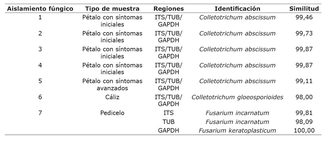 Los aislamientos obtenidos a partir de pétalos con síntomas iniciales y avanzados, se identificaron como Colletotrichum abscissum. Mientras el aislamiento obtenido en cálices correspondió a Colletotrichum gloeosporioides. En las muestras de pedicelos se encontró un aislamiento perteneciente al género Fusarium (Cuadro 3). En el caso de pétalos sin síntomas, no se obtuvo crecimiento micelial en ninguna de las repeticiones.