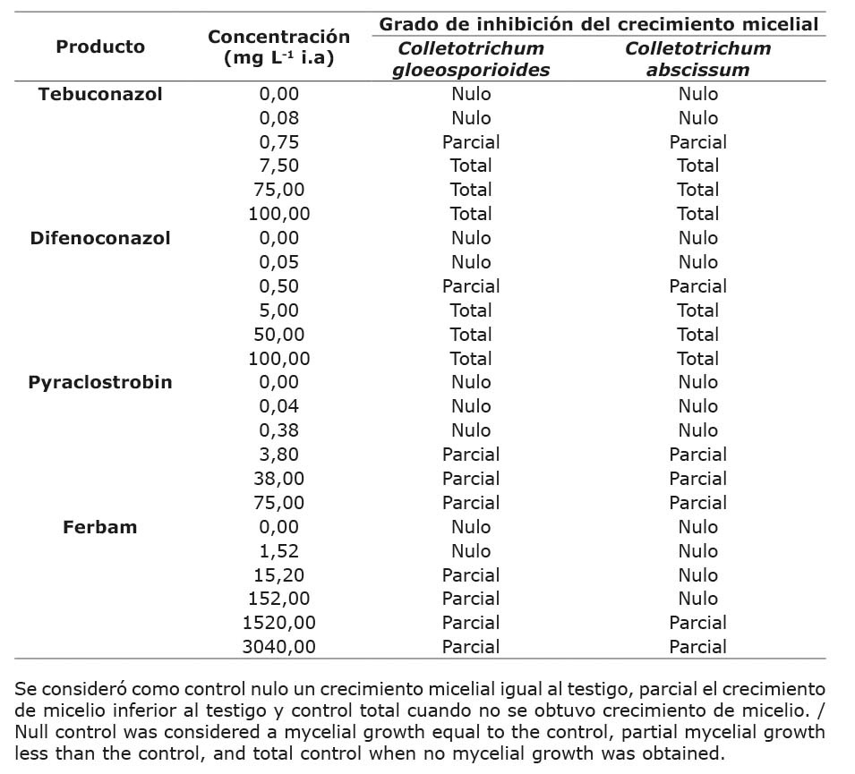 Para C. gloeosporioides el ferbam presentó un control parcial a partir de 15,2 mg L-1 i.a y a partir de 1520 mg L-1 i.a para C. abscissum. En la evaluación a los cinco días en todas las concentraciones se obtuvo crecimiento total de ambos aislamientos (Cuadro 4).