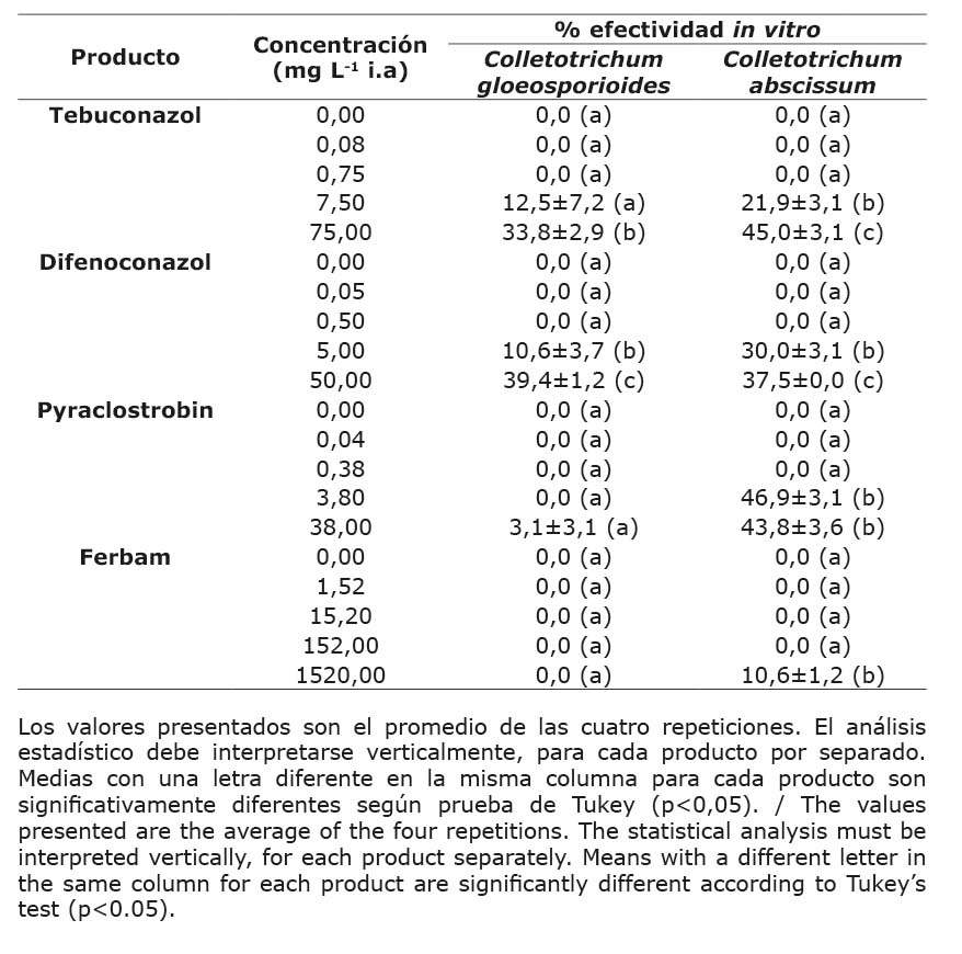 La efectividad de los fungicidas evaluados fue mayor para los triazoles, tebuconazol y difenoconazol, en ese orden, con control sobre C. gloeosporioides y C. abscissum a partir de la décima parte de la dosis comercial (7,5 y 5 mg L-1 i.a, respectivamente).