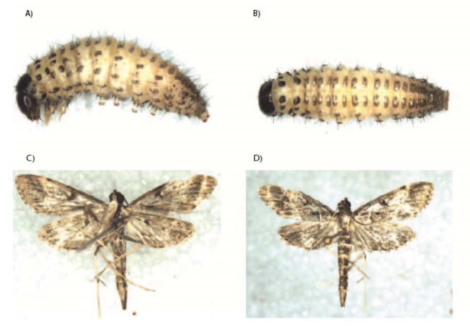 Figure 1. Pictures of D. fovealis collected from a strawberry farm of the canton of Vásquez de Coronado, San José, Costa Rica: A) lateral view of larva, B) side view of larva, C) ventral view of adult, D) dorsal view of adult. Entomology Laboratory, Universidad Nacional, Heredia, Costa Rica. 2019.