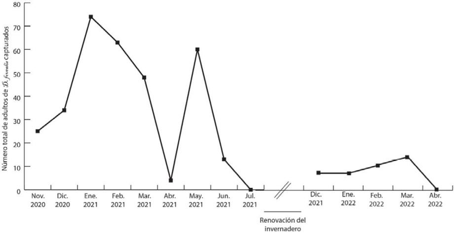 En el periodo 21–22, diferentes medidas como la aplicación de insecticidas (convencionales y orgánicos) y las medidas culturales como limpieza del rastrojo del invernadero e inclusive el mismo trampeo con feromonas, pudieron haber actuado de forma positiva de manera sinérgica en la disminución de la plaga en el área bajo estudio. Al igual como se reporta en Brasil, en Costa Rica, D. fovealis es una plaga exótica por lo que no se cuenta con insecticidas orgánicos o convencionales para su control, razón por la cual los métodos de control con mayores probabilidades de éxito son aquellos que priorizan la sanidad e higiene de los invernaderos, la interpretación de los niveles de afectación basado en las capturas en trampas y el uso de enemigos naturales (da Costa-Stuart et al., 2021).