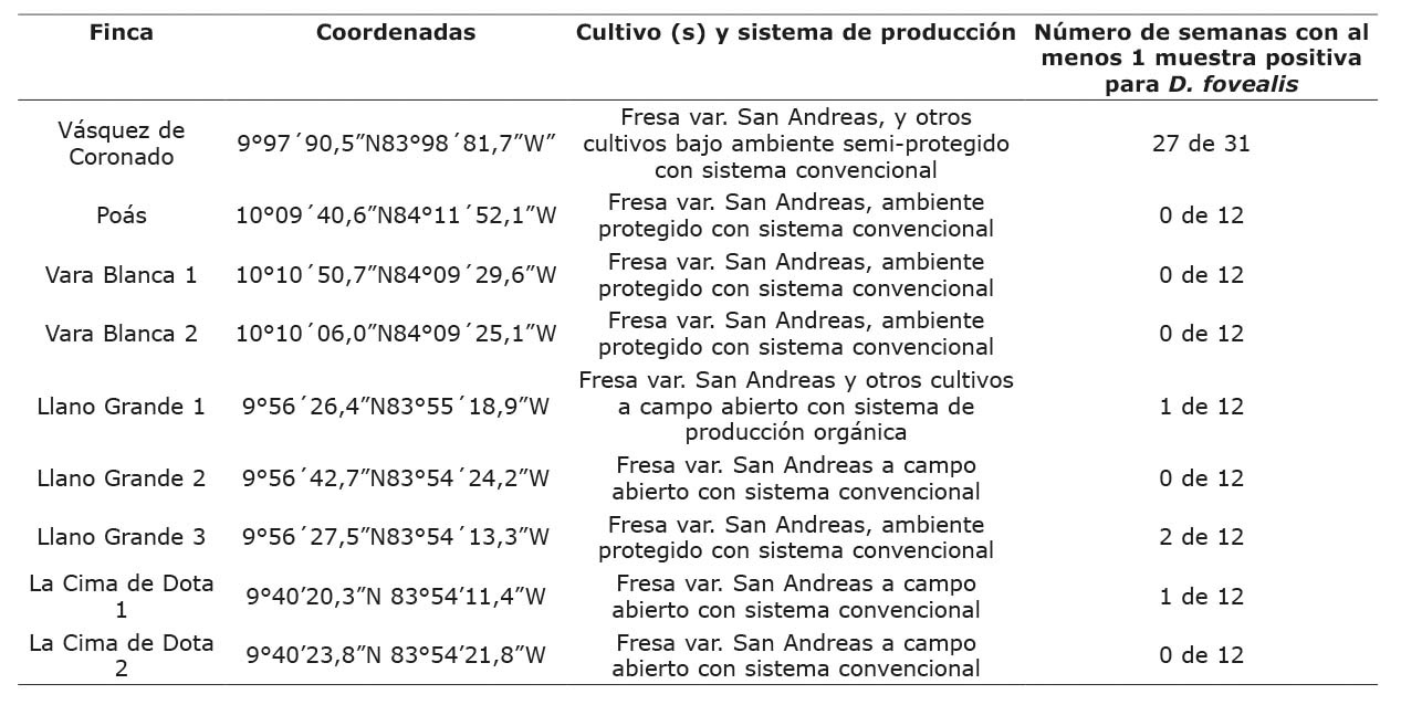 La finca donde se recolectó e identificó la primera polilla de D. fovealis, se seleccionó para la observación y monitoreo de la población de polillas durante dos periodos: de noviembre del 2020 a julio del 2021 y de diciembre del 2021 a abril del 2022. De forma similar, en noviembre del 2021, en cooperación con las oficinas regionales del Servicio Fitosanitario del Estado (SFE) como oficina ejecutora del Ministerio de Agricultura y Ganadería (MAG), se seleccionaron siete fincas freseras localizadas en las principales regiones freseras de Costa Rica: Poás de la provincia de Alajuela, Vara Blanca de la provincia de Heredia, Llano Grande de la provincia de Cartago y La Cima de Dota de la provincia de San José. A cada productor se le consultó sobre la familiaridad con la plaga, la variedad de fresa, prácticas del cultivo, tipo de manejo y demás información relevante, así como su disponibilidad para realizar monitoreos con feromona durante un periodo de doce semanas.