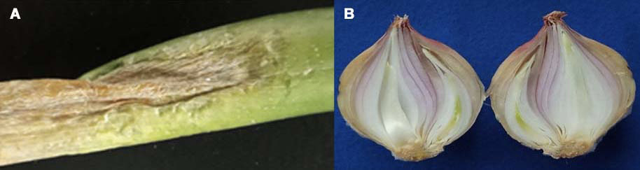 Barghouthi (2011), Delétoile et al. (2009)Figure 1. Photographic records of the symptoms found in onion (Allium cepa L.) leaves and bulbs. (a) Leaf with a light-brown depressed necrotic lesion, light brown, with a watery center, and surrounded by a chlorotic halo. (b) Internal part of the onion bulbs with brown and watery cataphylls. Plant Health Laboratory of the Faculty of Agricultural Sciences, Universidad Nacional de Colombia, Bogotá, Colombia. May, 2018.