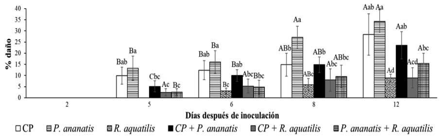Control positivo de P. ananatis (CP). Se aplicó un ANOVA multifactorial, seguido de una prueba de Tukey (p≤0,05) con el programa SAS. Letras minúsculas indican diferencias estadísticamente significativas entre los tratamientos. Letras mayúsculas indican diferencias estadísticamente significativas entre tiempos.