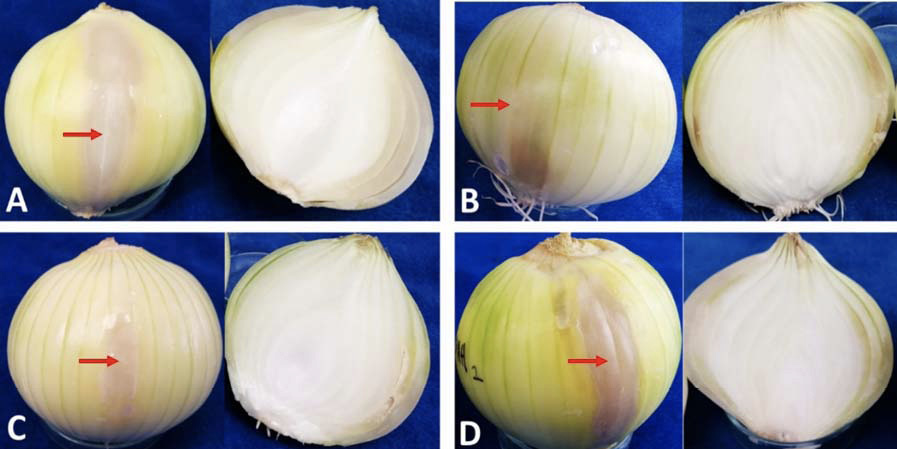 Figure 3. Front view and longitudinal section of onion (Allium cepa L.) bulbs 12 days after inoculation. (A) Inoculation with P. ananatis (H6A). (B) inoculation with R. aquatilis (B1B). (C) coinfection with P. ananatis (H6A) + R. aquatilis (B1B). (D) inoculation with P. ananatis (CP). Arrows indicate the point of inoculation. Plant Health Laboratory of the Faculty of Agricultural Sciences, Universidad Nacional de Colombia, Bogotá, Colombia. May, 2018).