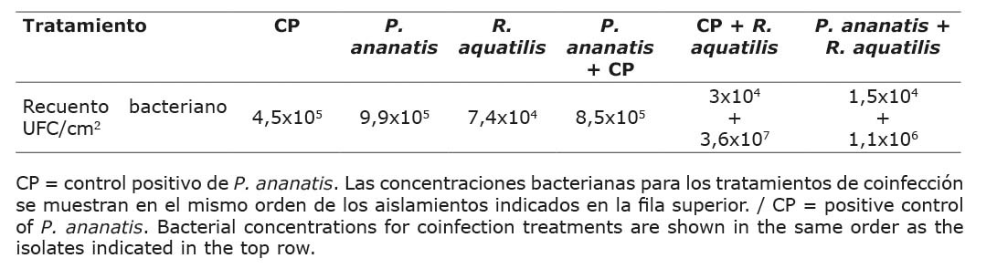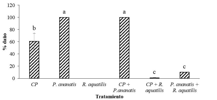 Para las pruebas de coinfección, se seleccionó la cepa de R. aquatilis con mayor virulencia, es decir, la cepa B1B en comparación con la cepa H5A. Las combinaciones de R. aquatilis B1B con P. ananatis (H6A y CP) generaron un menor daño. La menor severidad se observó con la coinfección R. aquatilis B1B y P. ananatis H6A (15,3 %), seguida de la combinación R. aquatilis B1B con P. ananatis CP (17,3 %). Además, se evidenció que la mezcla P. ananatis CP con P. ananatis H6A, generó un menor porcentaje de daño (23,5 %) en comparación con las inoculaciones individuales (Figura 2).