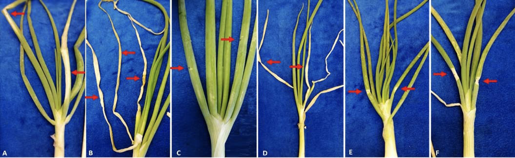 Figure 5. Onion (Allium cepa L.) plants 12 days after inoculation. (A) inoculation with positive control of P. ananatis (CP). (B) inoculation with P. ananatis (H6A). (C) inoculation with R. aquatilis (B1B). (D) coinfection with the positive control (CP) and P. ananatis. (E) Coinfection with the positive control (CP) and R. aquatilis (B1B). (F) Coinfection with P. ananatis (H6A) and R. aquatilis (B1B). Arrows indicate the point of inoculation. Plant Health Laboratory of the Agricultural Sciences Faculty, Universidad Nacional de Colombia, Bogotá, Colombia. May, 2018.