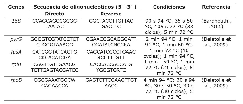 Con el fin de identificar a nivel de especie cada uno de los aislamientos, también se amplificaron los genes conservados de enterobacterias pyrG, fusA, rplB y rpoB, de acuerdo con las condiciones descritas en el Cuadro 1. Los productos de PCR, tanto de la región amplificada del 16S ARNr como de los genes conservados, se purificaron, secuenciaron y analizaron mediante el programa Bioedit. Finalmente, las secuencias se compararon contra la base de datos disponible en el GenBank, con el algoritmo Blastn.