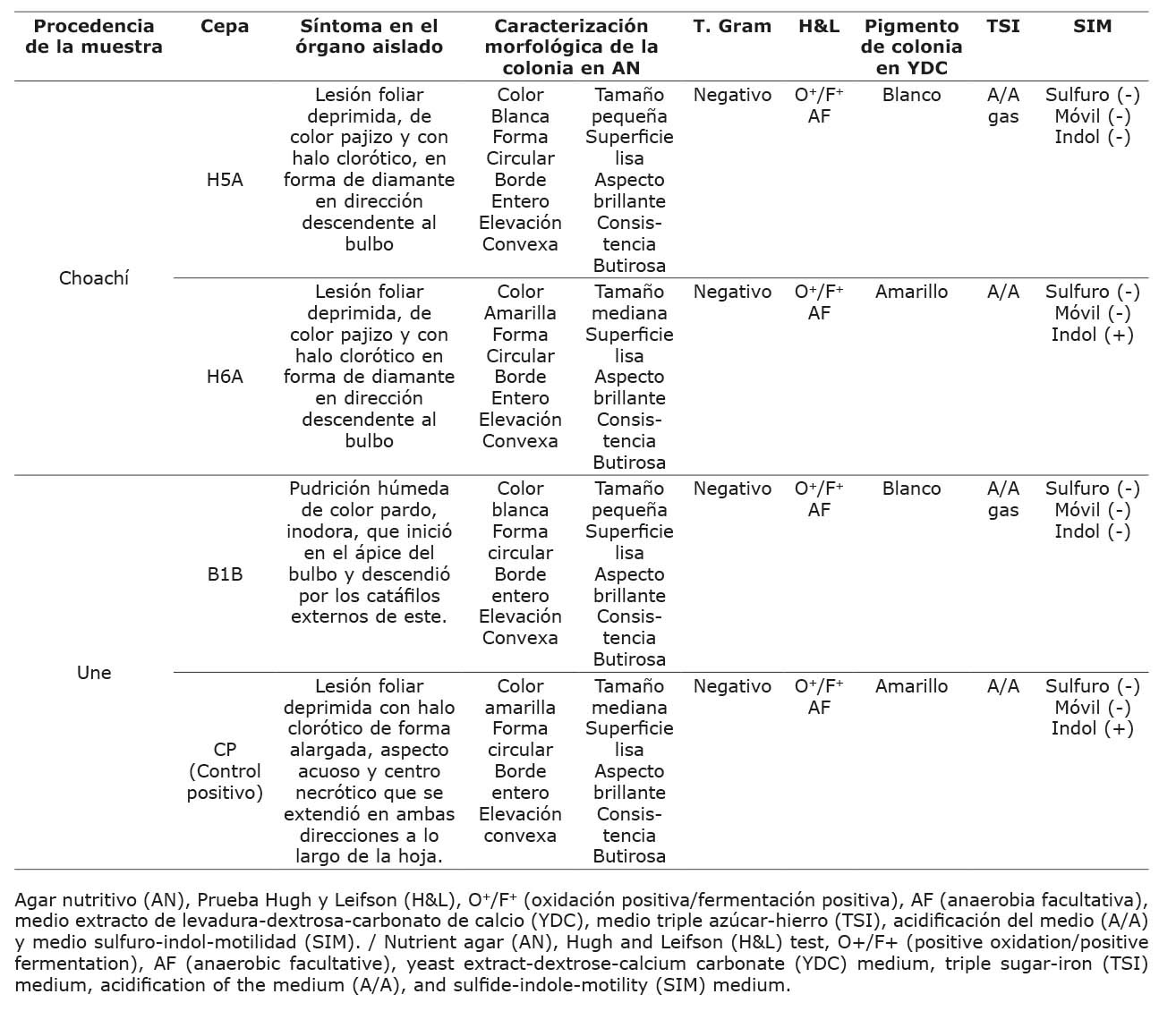 Los bulbos inoculados se dispusieron en condiciones de cámara húmeda y durante dos semanas se monitorearon hasta observar síntomas de pudrición alrededor del punto de inoculación. A partir de las lesiones generadas, se realizaron aislamientos bacterianos por medio de la metodología antes descrita, seguido de una caracterización macroscópica de las colonias, microscópica de las bacterias por medio de tinción de Gram y de la respuesta bioquímica de estas mediante las pruebas de Hugh y Leifson, Oxidasa, TSI (del inglés Triple- Sugar-Iron), producción de pigmentos amarillos en medio YDC, sulfuro indol motilidad (SIM), actividad ureasa, producción de pigmento fluorescente en medio King B (KB) y capacidad de la degradación de papa (AP), todo de acuerdo con Schaad et al. (2001).