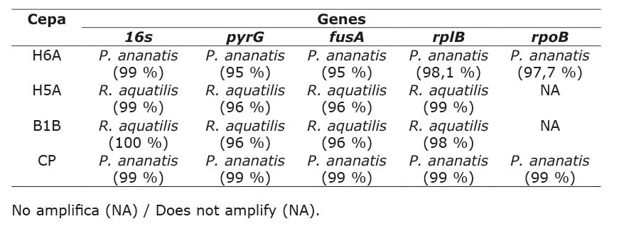 A nivel molecular, mediante MLSA de la región 16S rRNA y genes conservados (pyrG, fusA, rplB, rpoB), los aislamientos patogénicos fueron identificados como Pantoea ananatis (H6A) y Rahnella aquatilis (B1B y H5A) (Cuadro 3).