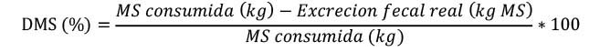 La digestibilidad de materia seca (DMS) in vivo se calculó mediante la ecuación 1 (Church et al., 2002) y la ecuación 2 (Velásquez et al., 2018):