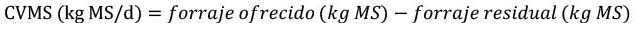 El consumo voluntario de materia seca por el método gravimétrico (CVMS) se calculó como el promedio de los seis días de medición (ecuación 3):