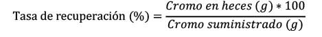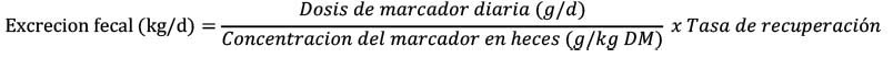 La estimación del CVMS por el método de marcadores (ecuación 6), empleó la DMS calculada por FDNi (ecuación 2) y EF estimada por Cr2O3 (ecuación 4), esta ecuación considera la tasa de recuperación de este marcador en el tracto digestivo del animal (ecuación 5).