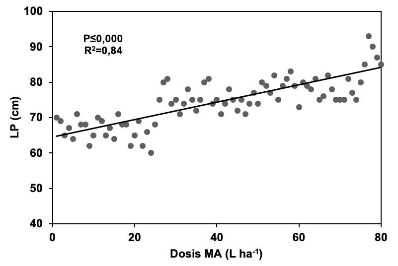 El análisis de regresión lineal mostró diferencias significativas entre los tratamientos. Un 84 % de las variaciones de la longitud de las plantas se debió al efecto de las dosis de bacterias, levaduras, hongos y actinomicetos autóctonos (MA), se obtuvo la ecuación de regresión (Figura 1). El resultado puso de manifiesto que al incrementarse las dosis de MA, se alcanzó un mayor crecimiento en longitud, con un rango de 75,24 cm a 7,84 cm en comparación con el testigo absoluto (66,52 cm).
