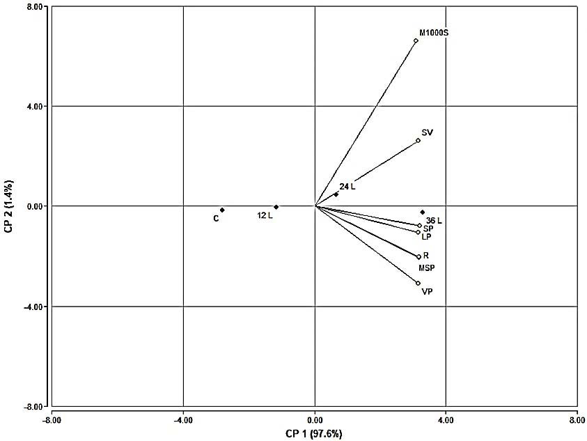 VP: pods per plant, MSP: mass of seeds per plant, R: agricultural yield, LP: length of plants, SP: seeds per plant, SV: seeds per pod, M1000S: mass of one thousand seeds. C: absolute control, 12, 24, and 36 L of MA.