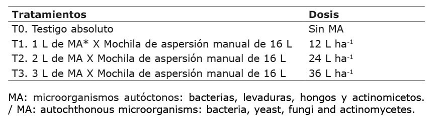 El biofertilizante usado fue de microorganismos autóctonos (bacterias, levaduras, hongos y actinomicetos), preparado en la propia finca con agua de pozo de óptima calidad, el mismo contenía tres componentes en su formulación: mineralógico (cloruro de sodio, 200 g en 200 L de agua), microbiológico (inóculo microbiano de la propia finca, 200 g de mantillo en 200 L de agua) y nutritivo (pasta nutritiva de origen vegetal que protege su composición por propiedad intelectual, 400 g en 200 L de agua). Una vez agregados los tres componentes al recipiente que contenía los 200 L de agua, se homogenizaron, se empleó un sello hermético y se dejaron fermentar a la oscuridad durante 72 h. El MA obtenido registró las siguientes características: pH 6,6, CE 1,4, poblaciones de bacterias totales ≥2x1012 UFC, hongos, levaduras y actinomicetos totales ≥2x1010 UFC; estas se determinaron por técnicas convencionales, según lo descrito por Vanderzant y Splittstoesser (1992), en el laboratorio de microbiología de la Universidad de Granma, Cuba.