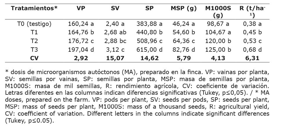 Table 2. Effect of biofertilization with autochthonous microorganisms (bacteria, yeasts, fungi, and actinomycetes) on the component variables of yield and agricultural yield in soybean (Glycine max) cv. Incasoy-27, established on a Brown Fluffy Carbonated soil in spring. Results obtained in the farm of extensionist farmer Luis A. López Chávez, located in the town of El Coco, Yara municipality, Granma province, Cuba. 2021.