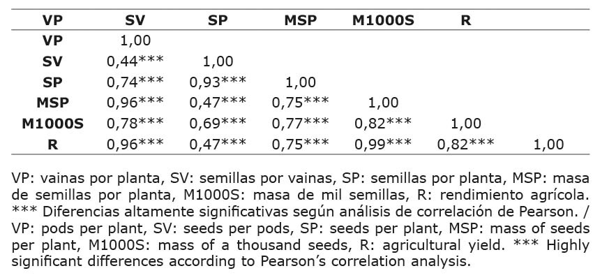 Los coeficientes de correlación de Pearson entre las variables analizados resultaron ser positivos y altamente significativos, lo cual señaló una relación entre el rendimiento agrícola y todas las variables evaluadas. Las asociaciones más altas se registraron entre el rendimiento agrícola, la masa de semillas por planta (0,99) y las vainas por planta (0,96), le prosiguieron la masa de mil semillas (0,82) y las semillas por planta (0,75). Mientras que entre las variables masa de semillas por planta y vainas por planta, semillas por planta y semillas por vaina, así como masa de mil semillas y masa de semillas por planta, experimentaron una fuerte correspondencia entre sí (Cuadro 3). El grupo de variables más interrelacionadas con el rendimiento agrícola de la soya cv. Incasoy-27 bajo las condiciones experimentales evaluadas, fueron la masa de semillas por planta y la cantidad de vainas por planta.